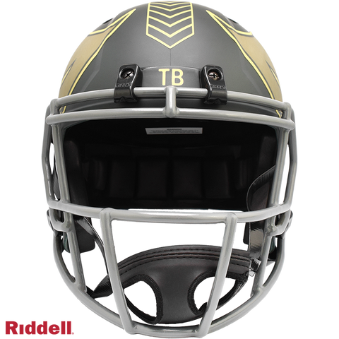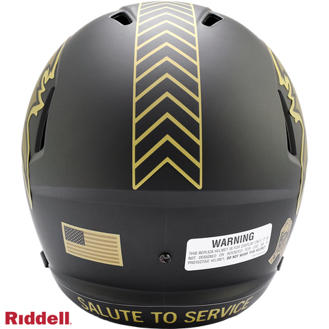 The 2025 NFL Salute to Service helmets are inspired by those used by the military for decades and are meant to honor the memory and selfless sacrifices of service members past and present. Each helmet is painted in a dark green satin finish with black appointments and dark gray face mask. The matte tonal decals match the official 2025 Salute to Service design elements and colorway. A chevron stripe pattern is used on every helmet, along with city name abbreviations on front bumpers, and Salute to Service back bumper decals. The helmet includes the official Salute to Service ribbon and a tonal U.S. flag. Made by Riddell.
