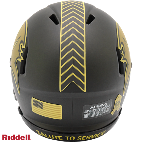 The 2025 NFL Salute to Service helmets are inspired by those used by the military for decades and are meant to honor the memory and selfless sacrifices of service members past and present. Each helmet is painted in a dark green satin finish with black appointments and dark gray face mask. The matte tonal decals match the official 2025 Salute to Service design elements and colorway. A chevron stripe pattern is used on every helmet, along with city name abbreviations on front bumpers, and Salute to Service back bumper decals. The helmet includes the official Salute to Service ribbon and a tonal U.S. flag. Made by Riddell.