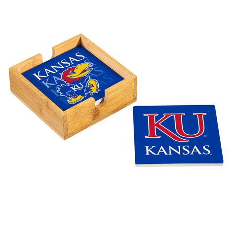 Kansas Jayhawks Coaster Set 4 Piece with Wood Caddy
