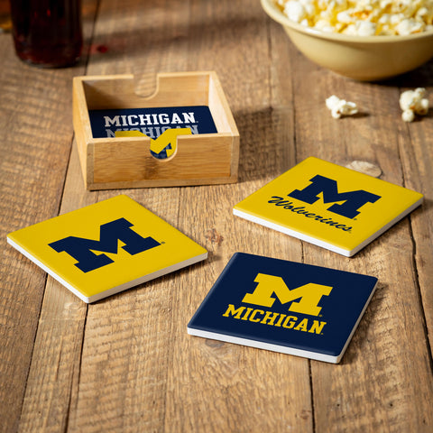 Michigan Wolverines Coaster Set 4 Piece with Wood Caddy