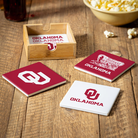 Oklahoma Sooners Coaster Set 4 Piece with Wood Caddy