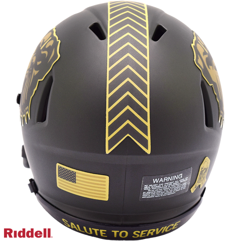 The 2025 NFL Salute to Service helmets are inspired by those used by the military for decades and are meant to honor the memory and selfless sacrifices of service members past and present. Each helmet is painted in a dark green satin finish with black appointments and dark gray face mask. The matte tonal decals match the official 2025 Salute to Service design elements and colorway. A chevron stripe pattern is used on every helmet, along with city name abbreviations on front bumpers, and Salute to Service back bumper decals. The helmet includes the official Salute to Service ribbon and a tonal U.S. flag. Made by Riddell.